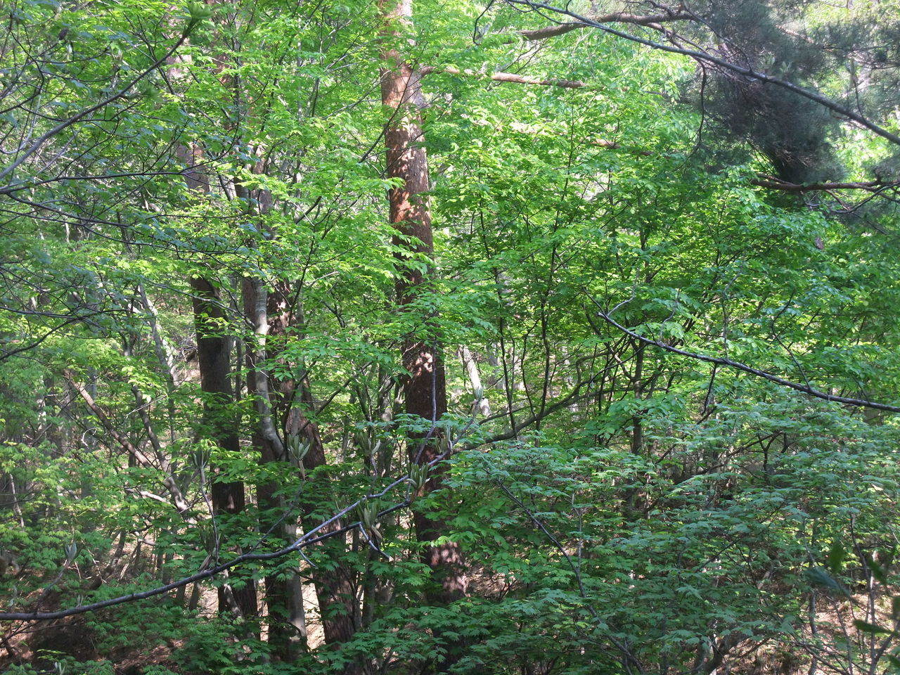 コシアブラは白っぽい枝で、写真のような頭頂部が特徴である。葉は5枚の子葉が掌状になって葉柄が長い。若葉をもぎとるように摘む。天ぷらにすると少し苦味があって、新緑を食べてるようでおいしい。地方によっては「山菜のキング」とか「山菜の女王」とか言われてる。