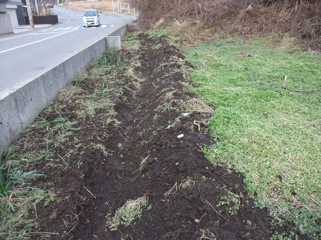 さて、写真は小宅の猫の額ほどの畑である。メインストリート(旧国道)に面してるため、道路側にチューリップの球根を植えた。例年、雪の下にトンネルを掘るハタネズミに球根を食害されていた。そこで、昨年、対策として溝を掘って囲んだところ効果があったので、今年も溝を掘った。